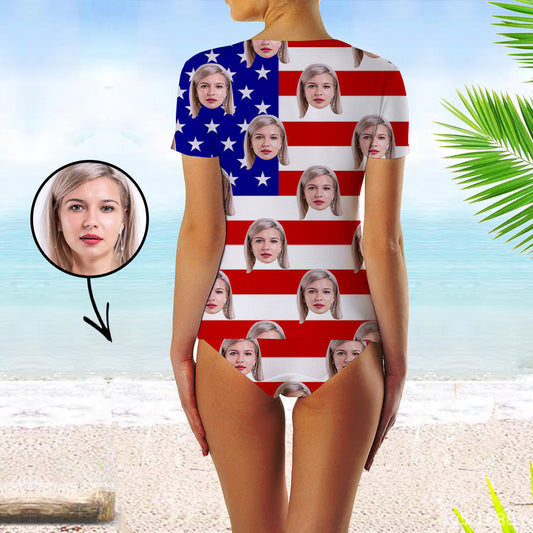 Custom Face Swimsuit Two Piece Face Swimsuit Face Bikini American Flag Personalized Bathing Suit For Women Short Sleeve