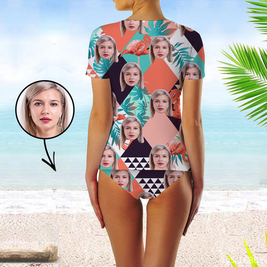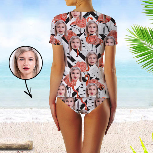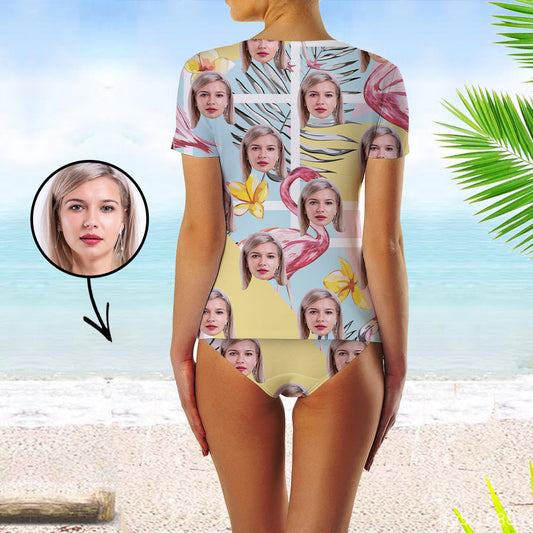 Custom Face Swimsuit Two Piece Face Swimsuit Face Bikini Tropical Flower Face Personalized Bathing Suit For Women Short Sleeve