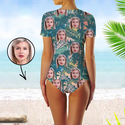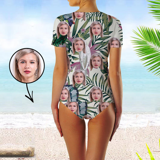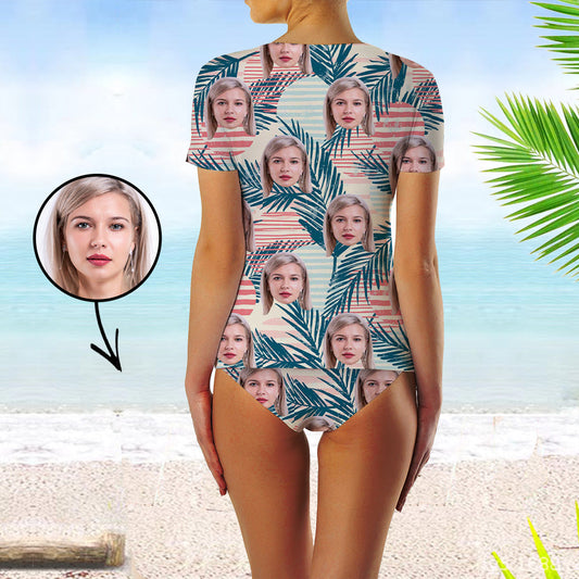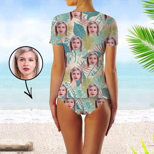 Custom Face Swimsuit Two Piece Face Swimsuit Face Bikini Tropical Vegetation Face Personalized Bathing Suit For Women Short Sleeve