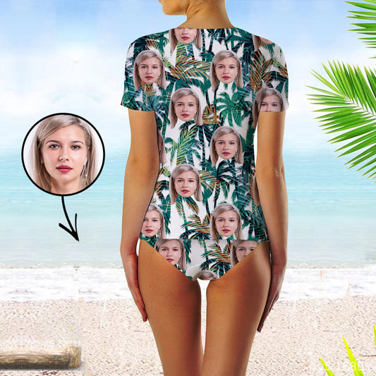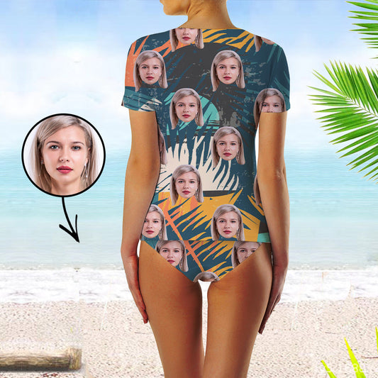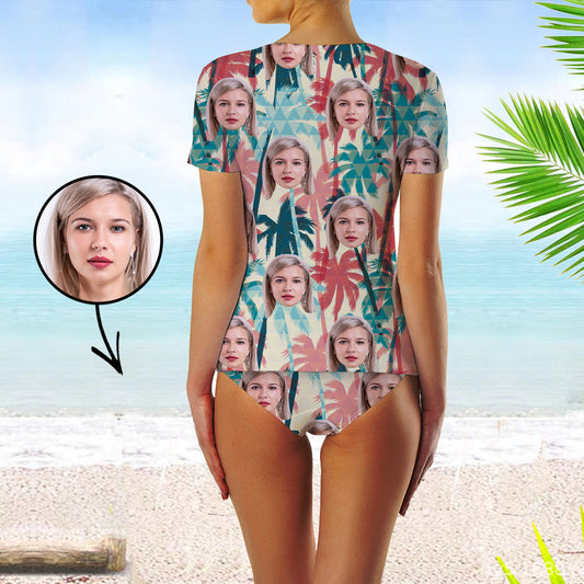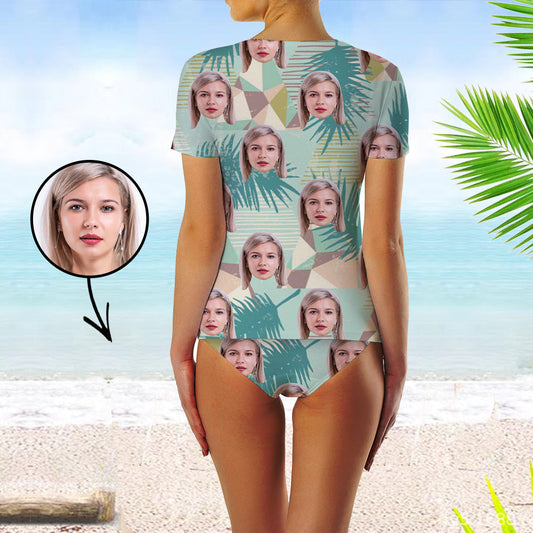 Custom Face Swimsuit Two Piece Face Swimsuit Face Bikini Tropical Island Face Personalized Bathing Suit For Women Short Sleeve