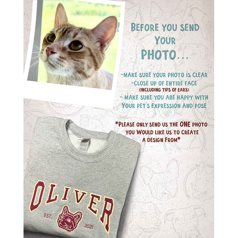 Give your love for your furry friend the perfect tribute with our custom embroidered pet sweatshirt! Whether it’s a T-shirt hoodie or sweatshirt, we’ll stitch your dog or cat’s adorable face directly from your photo, creating a one-of-a-kind wearable keepsake.