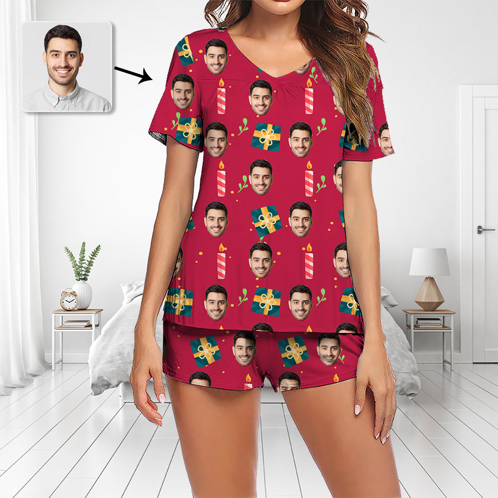 Custom Photo Pajamas Set Short Sleeve V-neck Pajama Women's Shorts Pajama Set Sleepwear Nightwear Christmas Gift For You