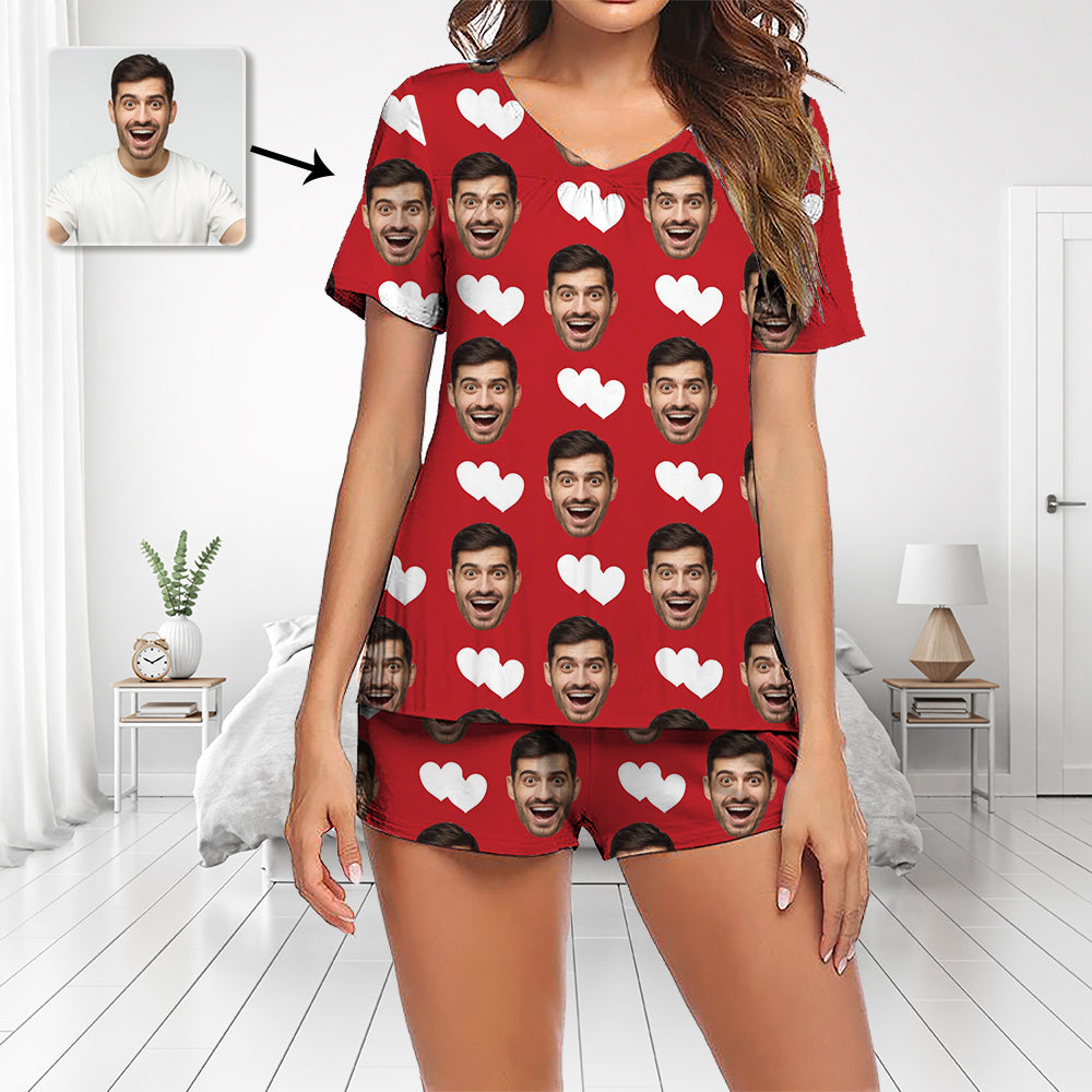 Custom Photo Pajamas Set Short Sleeve V-neck Pajama Women's Shorts Pajama Set Sleepwear Nightwear Heart I Love You